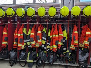 Dann ging es für uns in die Fahrzeughalle. Wir durften die Feuerwehrautos und das Rettungsboot anschauen. Alle Kinder konnten den Helm und die Jacken eines Feuerwehrmanns ausprobieren. Das war vielleicht eine schwere Kleidung!