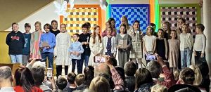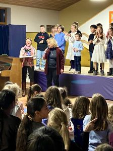 Als neue Organisatorin hatte Frau Wieler mit 18 jungen Musikerinnen und Musikern, darunter auch zwei ehemalige Schülerinnen, ein abwechslungsreiches Programm einstudiert. Durch ihre Tätigkeit als Klavierlehrerin war sie für diese Aufgabe bestens vorbereitet. Sechs Moderatorinnen und Moderatoren aus den 4. Klassen führten gewandt durch den Abend. Zu hören waren viele Klavier- und Flötenstücke. Zum Abschluss sangen alle gemeinsam das Lied „Der Wind, der alte Musikant“. Belohnt wurde die gekonnte Darbietung mit begeistertem Applaus.